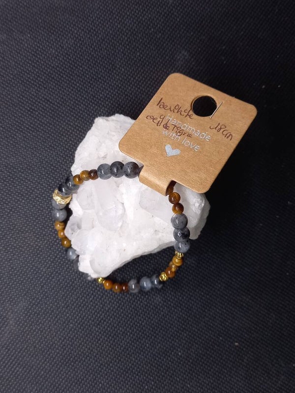 Bracelet avec des perles de 6mm de diamètre pour la larvikite et 4 mm de diamètre pour l'oeil de tigre. 18cm de tour de poignet.